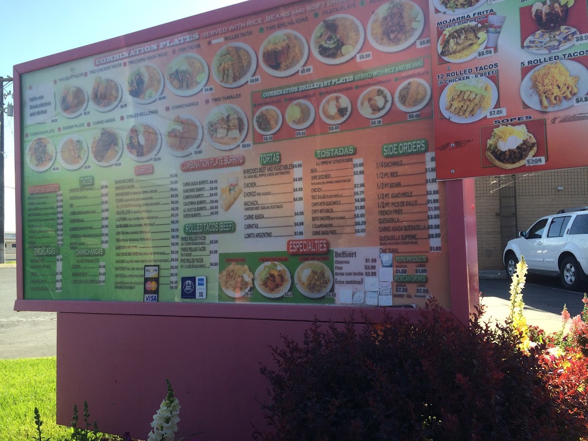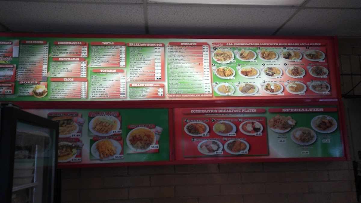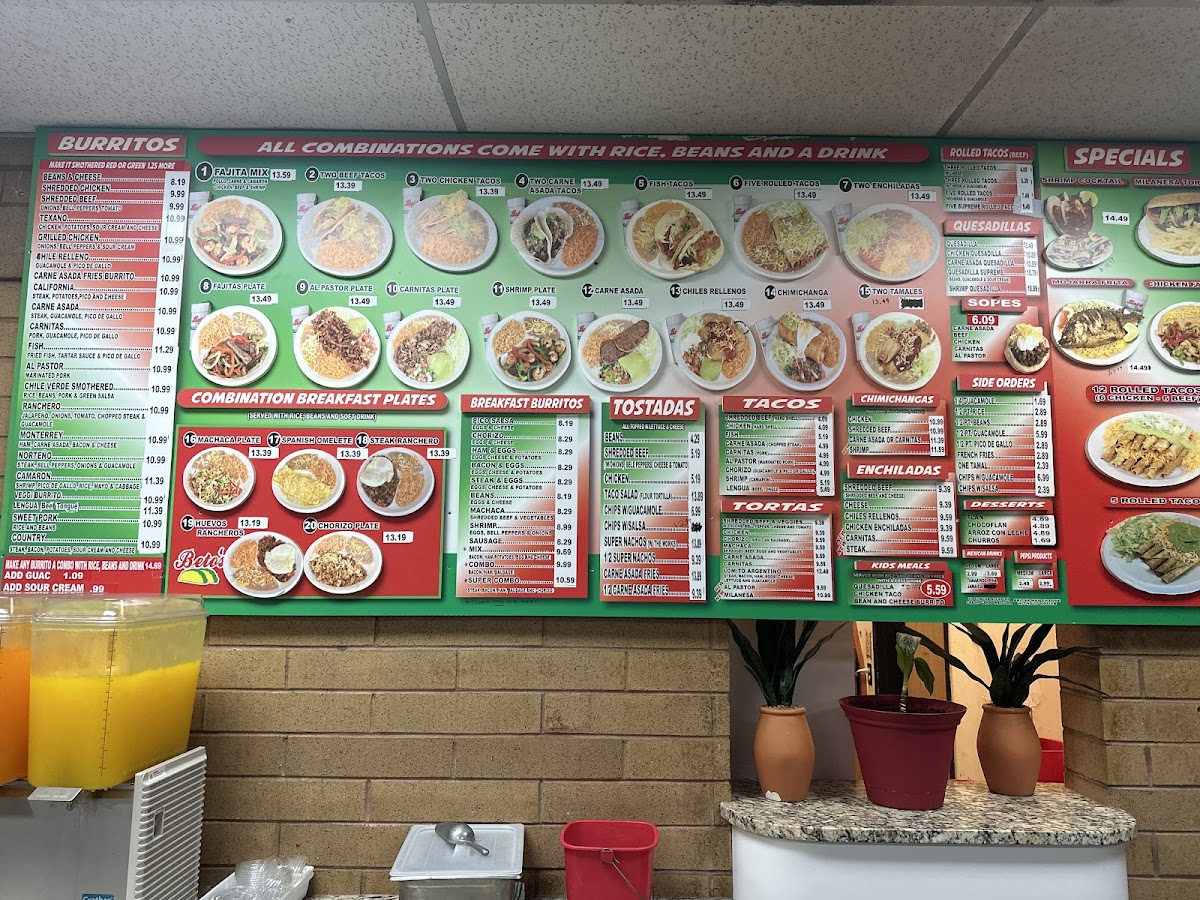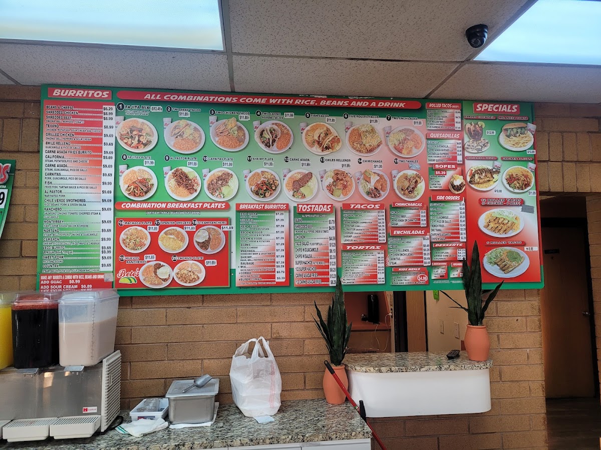 Steak, pico de gallo, enchilada salsa, and two eggs. Accompanied with rice, beans, and one flour tortilla.